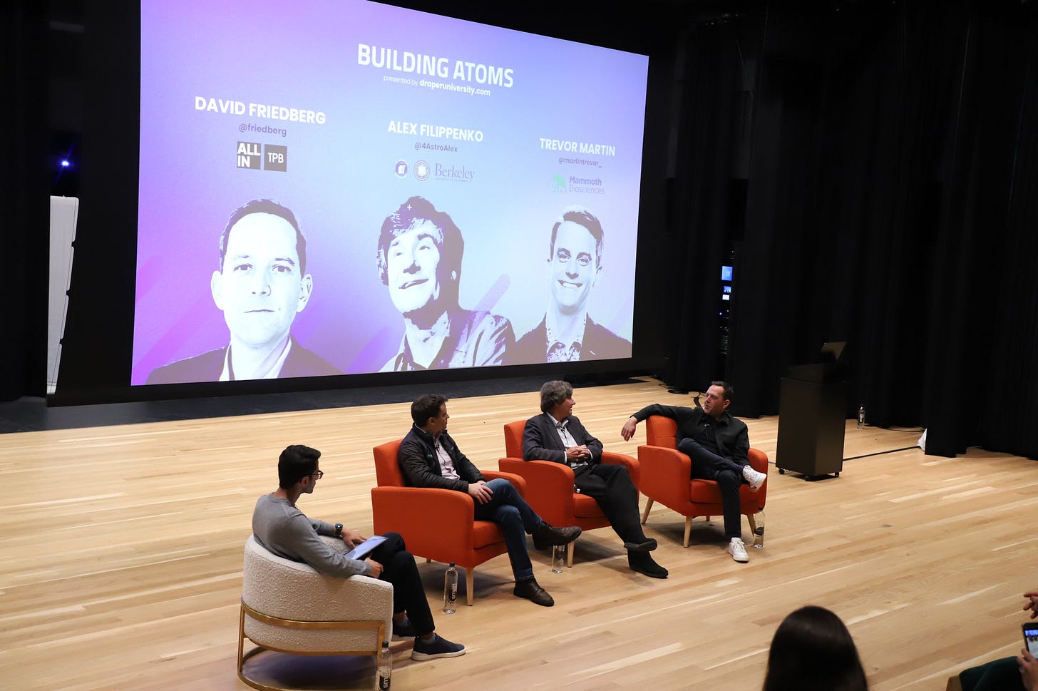 I knew we needed to inspire more technologists to work on hard problems in the world of atoms, the best way I thought I could inspire was through events. So I started a series called “Building Atoms” and hosted an event at a16z’s first NY TechWeek followed by a summit in SF featuring David Friedberg (the sultan of science on All-In podcast), Trevor Martin (Cofounder & CEO of Mammoth Bio) and Alex Filippenko (an award winning astrophysicist who worked on the theory of dark matter), here is a photo below. Some of you might remember it.